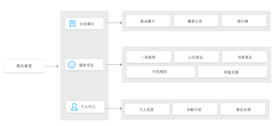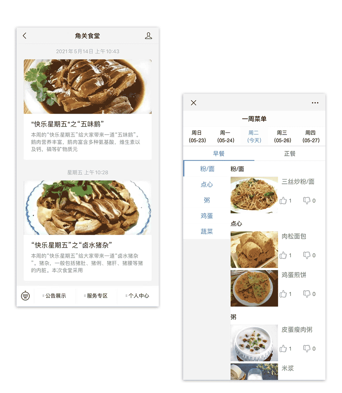 角关食堂 1、项目概述: “角关食堂”,关员通过关注公众号注册信息,即可在线点餐、餐后评价及预期菜品选择等服务。后台管理系统可对数据进行整合分析,制定关员满意的菜单,避免食物浪费和菜品不足,通过关员评价为食堂提供便利的管理模式,帮助食堂改进服务与菜品,提高关员满意度。 2、系统架构设计 3、项目展示 ``